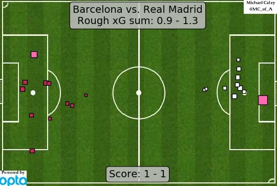 Надалі Барселона увімкнулася й перехопила ініціативу, тримаючи її аж до останньої десятихвилинки – взнаки далися фактор "Камп Ноу", кураж гравців правого флангу та не дуже вдалі заміни Соларі. Втім, крім голу та загострюючих дій Малкома, Барселона нічого особливого й не створила, адже оборона Реала здорово читала гру – вона виграла за кількістю перехоплень (17:19), блокуваннями (11:16) й майже не поступилась за відборами (18:17). Сталевий характер "бланкос" також проявив себе – не дивлячись на повну домінацію каталонців у середині обох таймів, мадридці терпіли й виграли їх завершення. Кінцевий показник коефіцієнту очікуваних голів яскраво доводить невипадковість рахунку на табло: