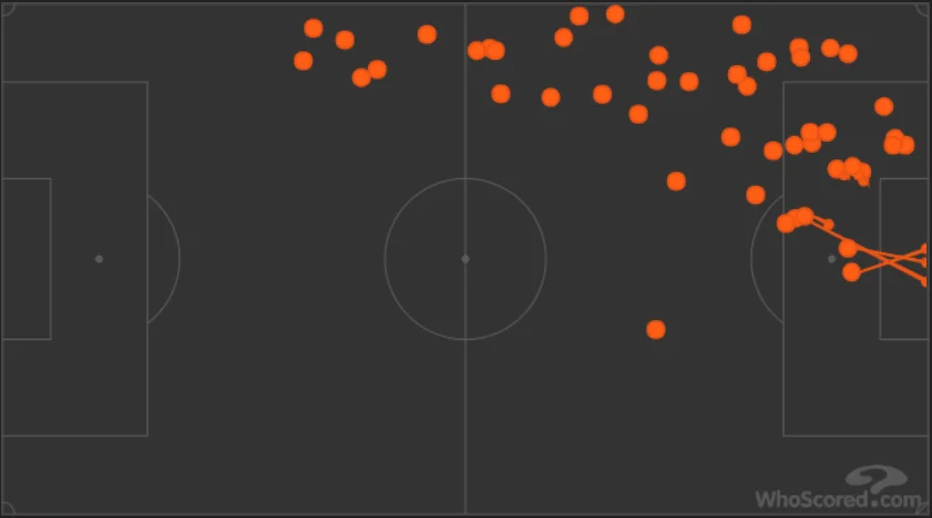 Більшою проблемою є той факт, що Вінісіус практично не допомагав у захисті. Соларі свідомо зробив ставку на цей фланг, змусивши навіть Регілона активніше йти вперед, в той час як на підстраховці мав діяти Каземіро. Втім, опорник не завжди встигав у активний відбір, а пасивність Жуніора в обороні була занадто великою навіть для звільненого від неї гравця. Карта дотиків яскраво демонструє зацікавленість вінгера в грі позаду.