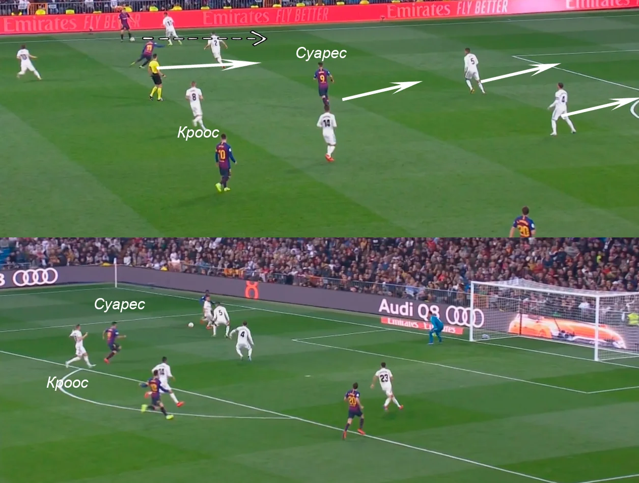 Крім того, трійка центрхавів Реала дуже уважно стежила за Ракітічем, намагаючись залишати його без м'яча та передаючи його під опіку на всій глибині центральної зони – як наслідок, руйнівник Каземіро при вдвічі меншій кількості пасів зробив практично однакове число передач в останню третину поля (12 проти 16). Ця картина особливо була помітною в першому таймі.
