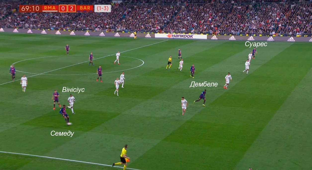 По-друге, латералі Барси не могли підтримувати атаку настільки часто, як у інших матчах. Семеду боявся залишати Вінісіуса за спиною, а на протилежному фланзі Васкес допомагав Карвахалю з Альбою і Дембеле – форвард виконав аж 6 відборів (100% успішних, 4 на власній половині). Йому ж належать 6 втрат м'яча, але чотири з них відбулись у атаці, при цьому це не ставши наслідком відбору з боку суперника. Цікаво, що перші ж якісні вмикання крайків Барси призвели до голів.