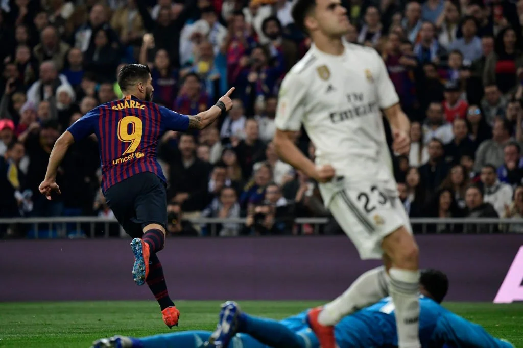Барселона в рамках 1/2 фіналу Кубка Іспанії здобула велику виїзну перемогу над Реалом завдяки голам Луїса Суареса та автоголу Рафи Варана .