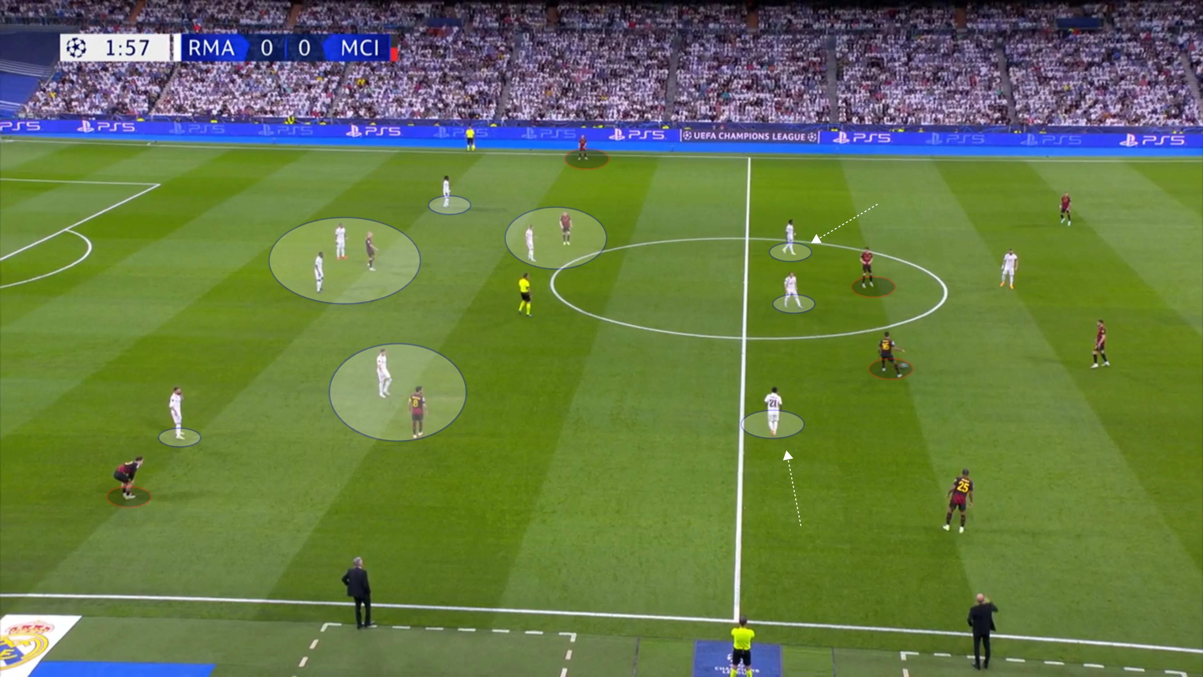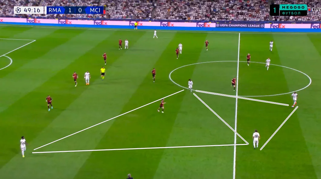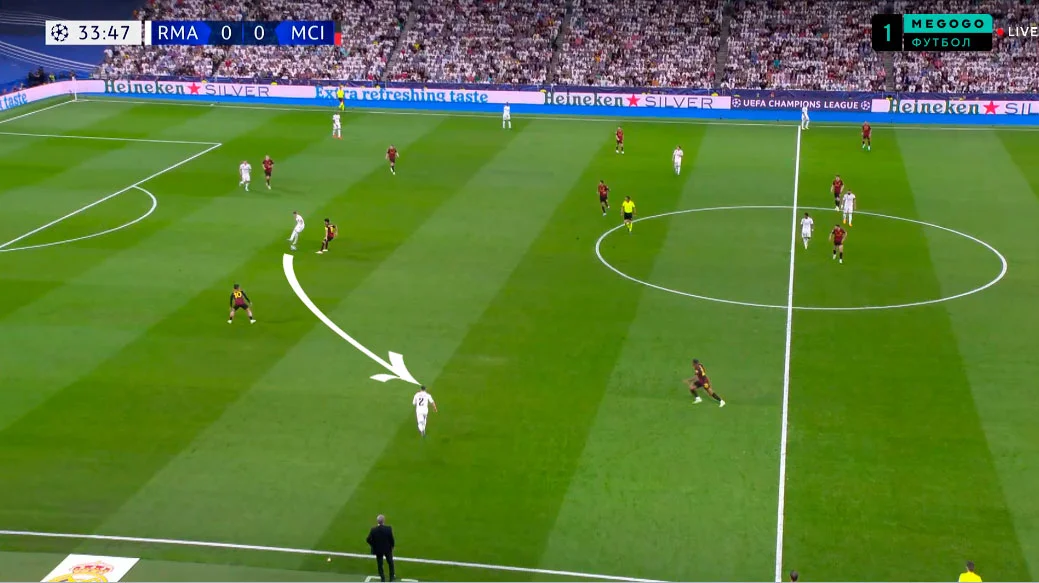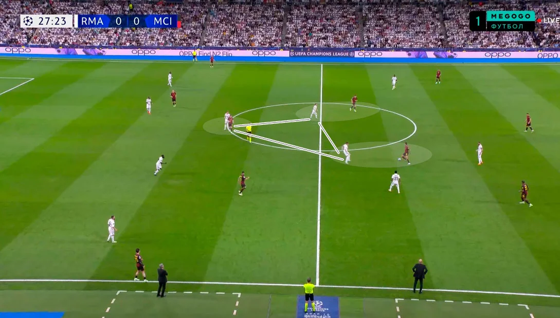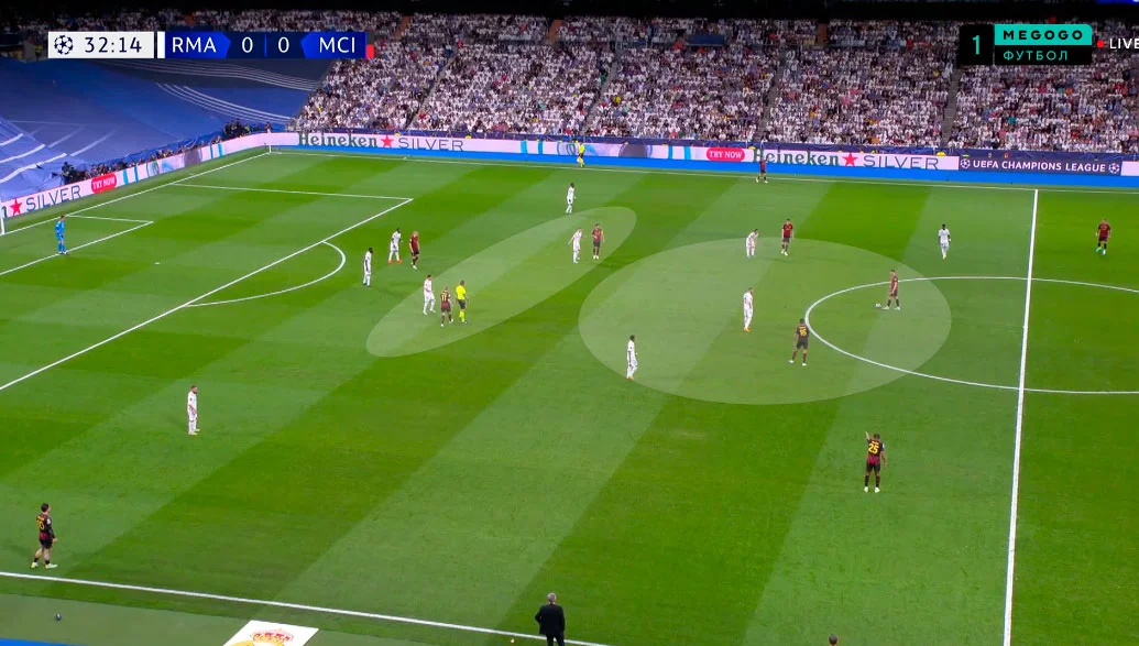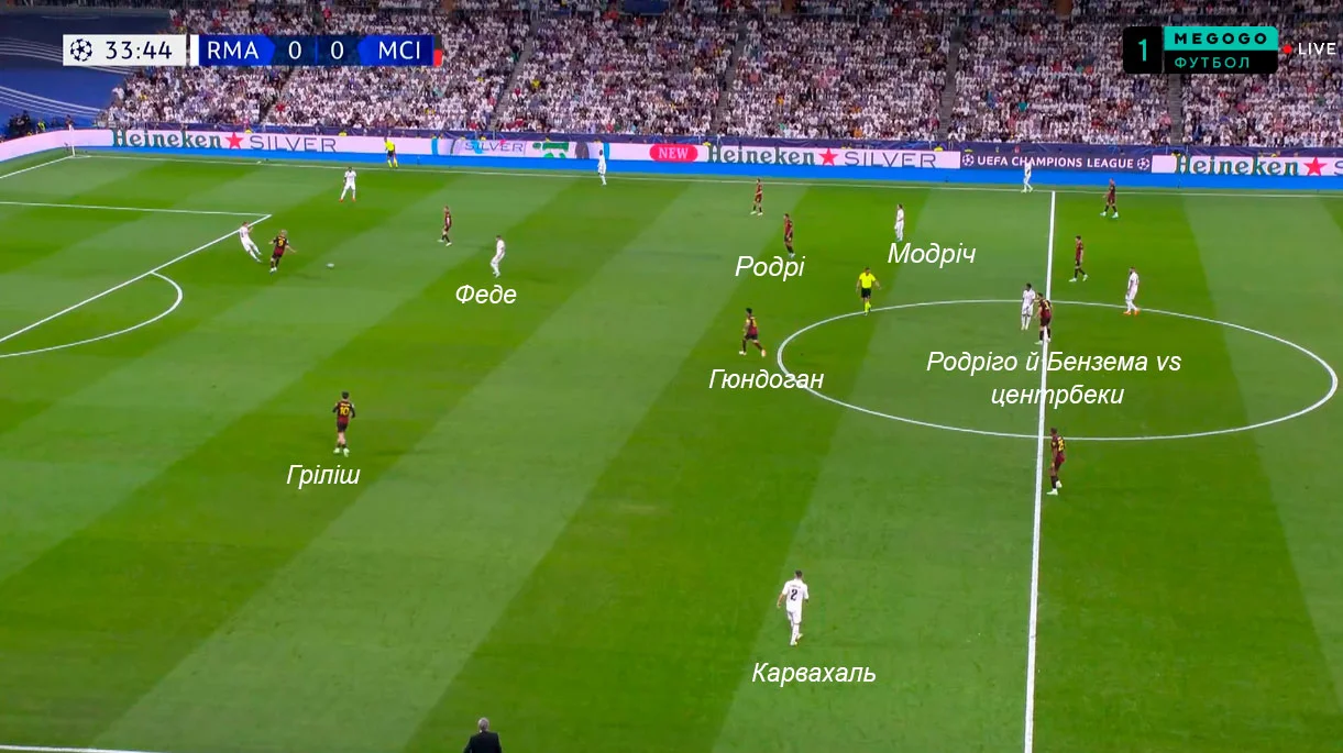 В цю ж мить Родріго й Бензема тиснули на центр оборони Ман Сіті, пропонуючи варіанти передачі в ноги або за спину. Карвахаль одночасно розтягнув структуру відкриванням за спиною Гріліша.