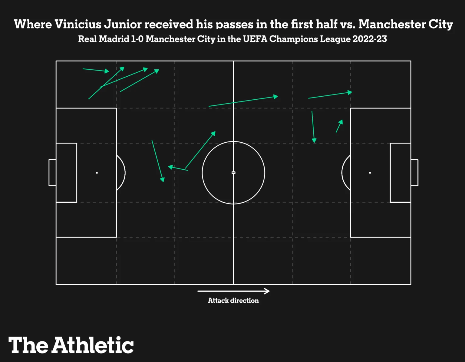 Атака Реала спиралась на організацію ривків Вінісіусу та обіграшів з ним. От тільки в перші 20 хвилин контргри практично не було (за виключенням одного епізоду). Манчестер Сіті якісно блокував варіанти для діагоналей на бразильця.