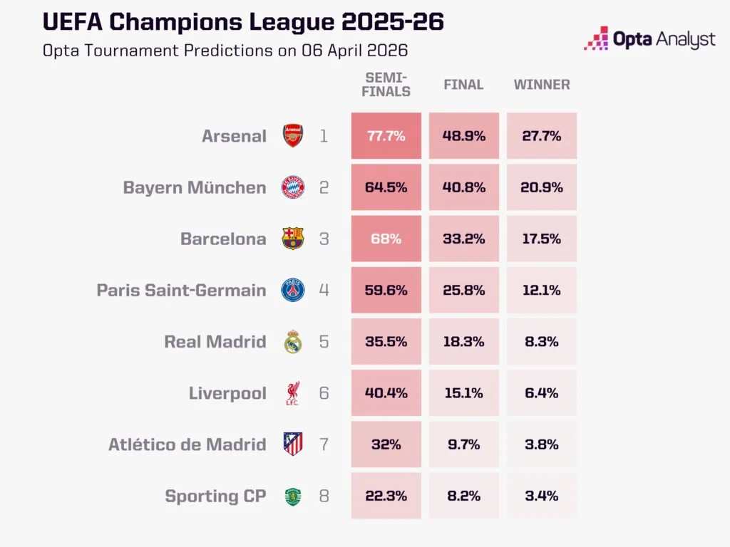 Дивне перше місце Арсенала у даному рейтингу пояснюється простішим календарем лондонців, тож більш важливим показником є 20% шансів на успіх Баварії. Її оцінюють вище за будь-якого гранда в Європі, що могло б здивувати пересічного фана. На тлі інтриги в АПЛ, війни грандів у Ла Лізі та італійських драм мало хто помітив, наскільки монструозну машину Венсан Компані вибудував у Мюнхені.