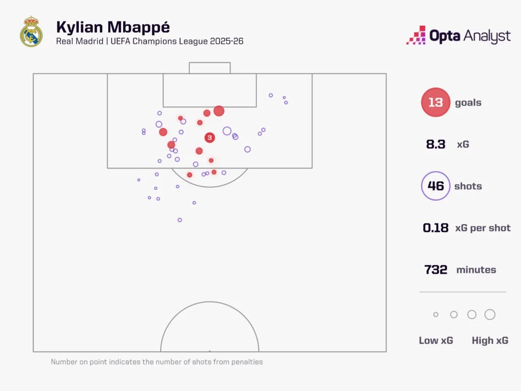 От тільки розширена статистика демонструє, що практично за всіма показниками Реал кращий з Мбаппе, ніж без нього. Команда створює значно більше моментів, набагато небезпечніша у контратаках, а якість оборони не залежить від наявності француза. Кількість високих повернень так і зовсім покращується, адже з Кіліаном на вістрі Реал схильний вертикалізувати свій футбол (відповідно, зростає кількість втрат).