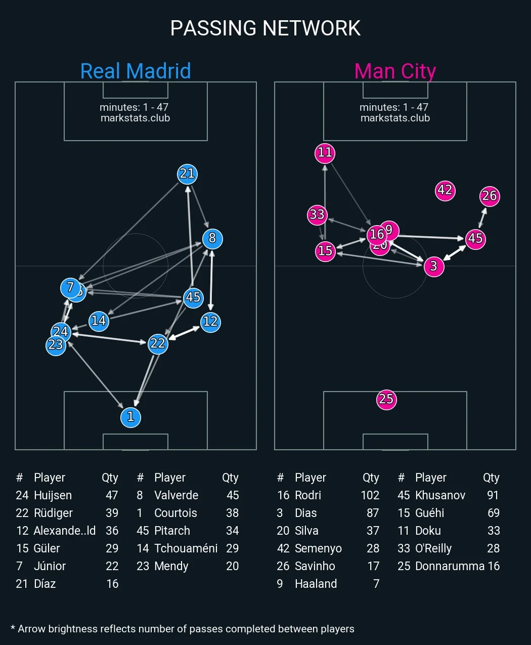 На карті ігрових зв'язків Манчестер Сіті можна помітити U-подібну структуру. М'яч рухався з флангу на фланз через серії передач назад і поперек. Це – ознака поганої позиційної атаки (а точніше її відсутності).