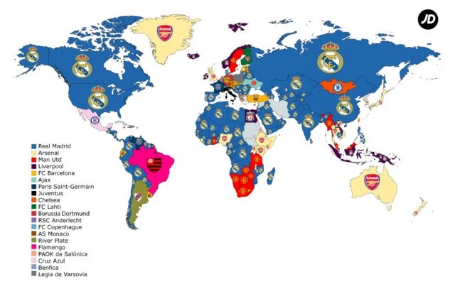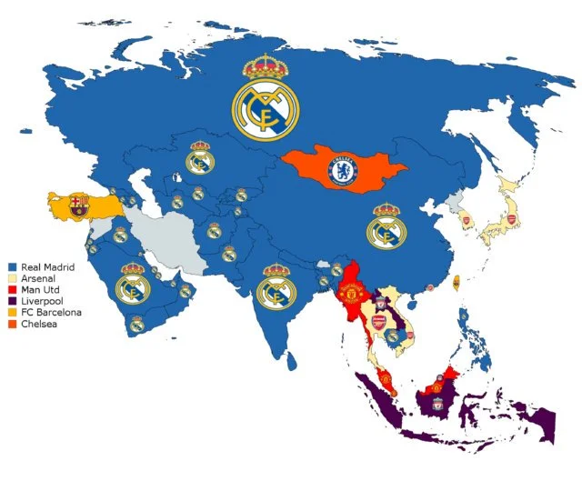 У багатомільйонних азійських країнах (Китай, Індія, Росія) найчастіше гуглять Реал. Аналогічна ситуація на Близькому Сході, Кавказі та Центральній Азії. У Японії, Південній Кореї, Австралії та Новій Зеландії лідирує Арсенал – недарма "каноніри" там проводять передсезонну підготовку. На півострові Індокитай і в Індонезії в топах англійські клуби (Манчестер Юнайтед, Ліверпуль).