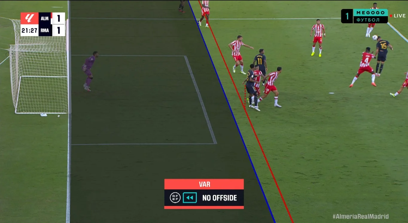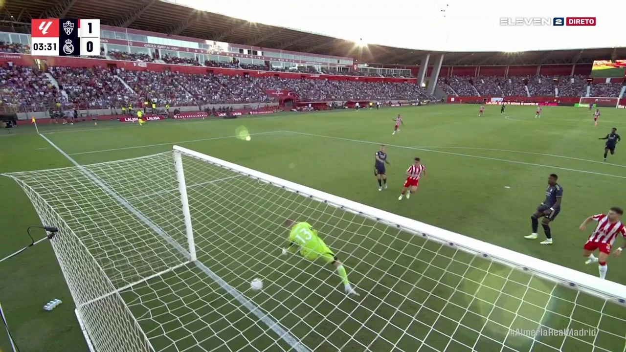 Лукас Робертоне після перерви так само всюди. І шукає паси для загострення (3 за неповну годину), і сам пробиває (5). Рамазані ножицями у падінні більш ефектно, ніж загрозливо, пробивав. Лунін розташувався по центру, куди й прилетів м'яч. Вінісіус претендує на пенальті та заробляє жовті для суперників. По 2-3 гравці Альмерії з допомогою рук зупиняють проходи бразильця, який більшою мірою страждає на позиції в центрі нападу. А виграє від відсутності класичного центрфорварда галактичний Беллінгем. Джуд вривається у штрафний під навіс земляка Крооса і випереджає воротаря.