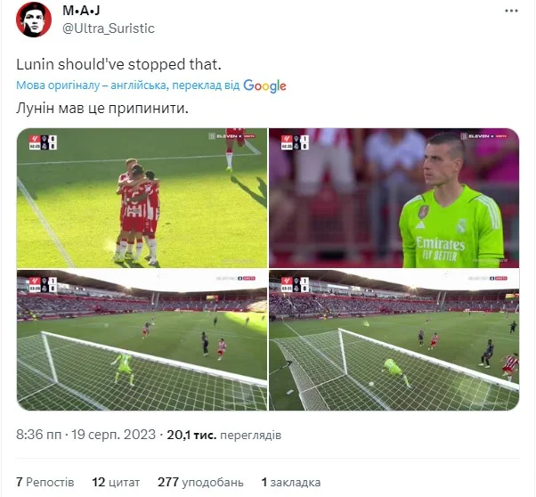 Цього літа 21-річний Серхіо Аррібас за 6 мільйонів євро покинув команду Анчелотті заради ігрової практики. Саме цей атакувальний півзахисник замкнув стрімку контратаку Альмерії лівим флангом. Реал залишив надто багато вільних зон після свого стандарту на чужій половині, Кроос не встиг прикрити у верховій дуелі, а Лунін пропустив удар, який ішов прямо в нього. Ніби й впритул розстрілював Аррібас, але вину на Андрія в Іспанії за таке покладатимуть. Мінус 0,27 xG відведеної загрози також не говорять на користь нашого легіонера.