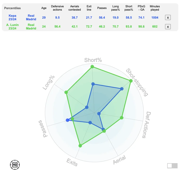Така низька залученість Луніна до гри залишає шанси для Кепи. Чіткої відповіді, хто заслуговує на основу прямо зараз, тренери не отримали – хоча загальна статистика по сезону повністю на боці українця (у нього найвищий відсоток сейвів у Ла Лізі 2023/24, 87%).