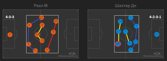 Карло Анчелотті зрозумів, що за таких обставин Реал цілком може програти матч. Гості чудово взаємодіяли у позиційних атаках, та мали вдосталь простору та часу. У господарів попереду четвірка гравців групи атаки намагалася тиснути на трапецію Шахтаря (п'ятірка гравців, які відповідають за короткий розіграш у початковій стадії атаки), але у більшості випадків цей пресинг розбивався. Відповідно, вільні зони для швидкого розвитку атаки виникали у другій третині. Якщо Реал підіймав лінію захисту, щоб забезпечити вертикальну компактність, виникала загроза закидань на хід Фернандо та Мудрику.