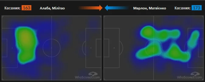 Дуже показово виглядає теплова мапа пар центральних захисників обох команд. Подивіться і порівняйте, де взаємодіяли Алаба та Мілітао, і як високо грали Марлон та Матвієнко.
