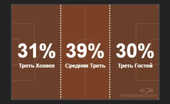 Мадрид більше будував свої атаки через лівий фланг, тоді як Шахтар був збалансованішим. До речі, рідко коли можна побачити такий високий показник конструктивних дій у центральній зоні. Щодо показників активних дій у горизонтальних зонах, то і тут команда Де Дзербі не поступилася і навіть на один відсоток має перевагу.