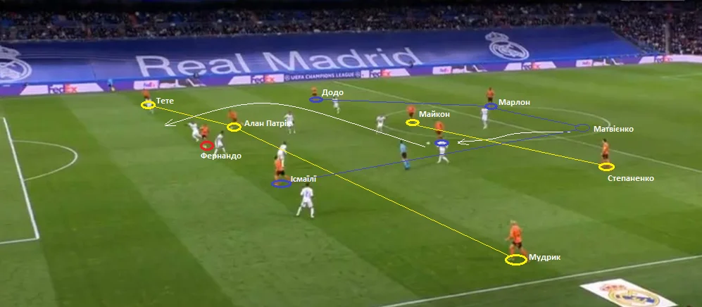 Мабуть, гравці Реала не очікували від Миколи таких тонких дій. Центрбек збірної України спокійно протягнув м'яч до кордону другої і третьої третин поля і технічно закинув у глибину. Алан Патрік і Фернандо не менш ефектно завершили епізод.