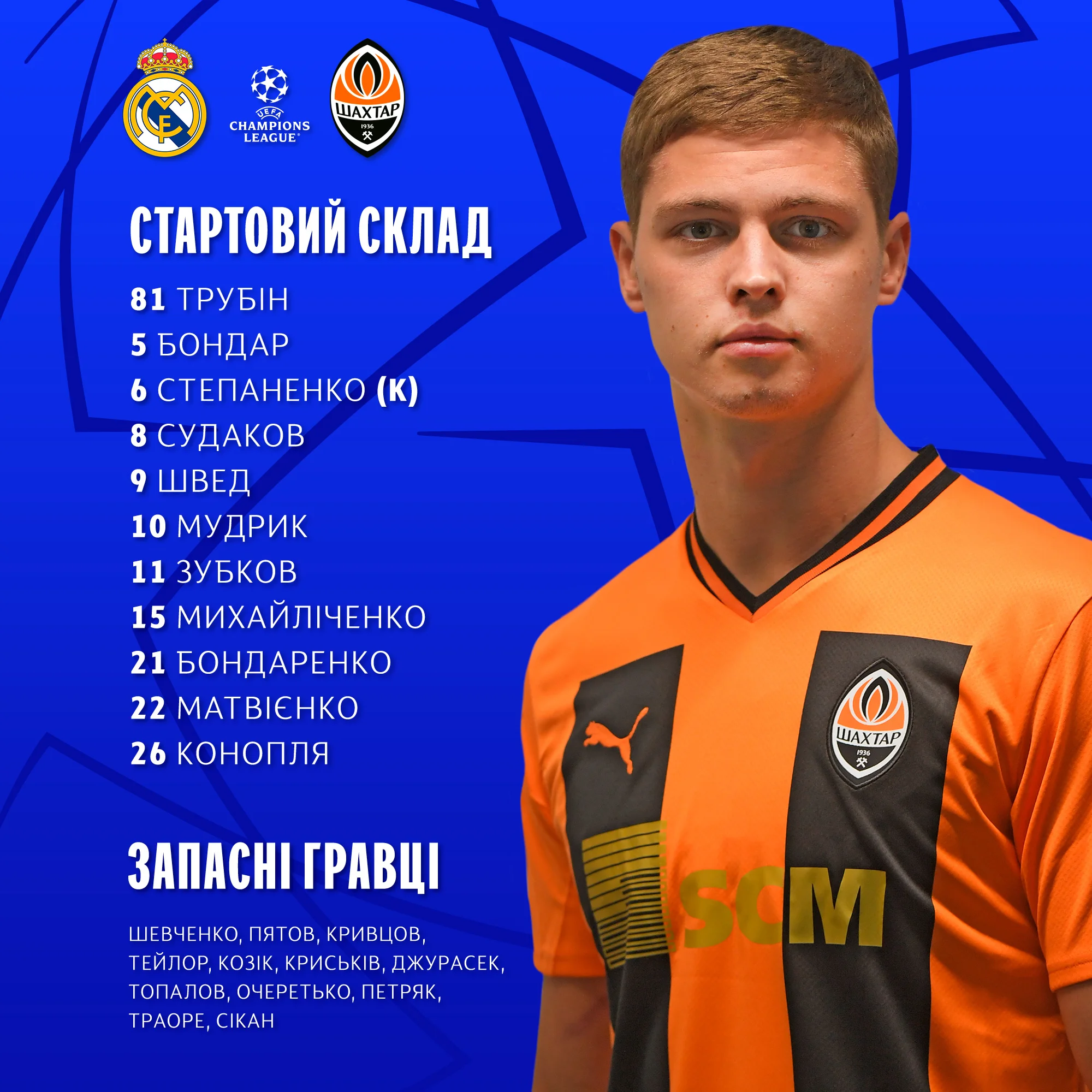 Шахтар: Трубін – Конопля, Бондар, Матвієнко, Михайліченко – Степаненко, Бондаренко – Швед, Судаков, Мудрик – Зубков