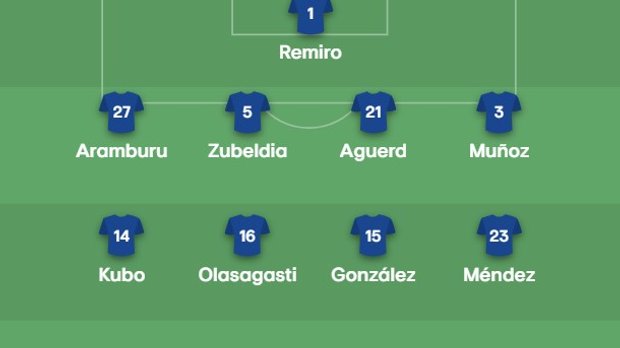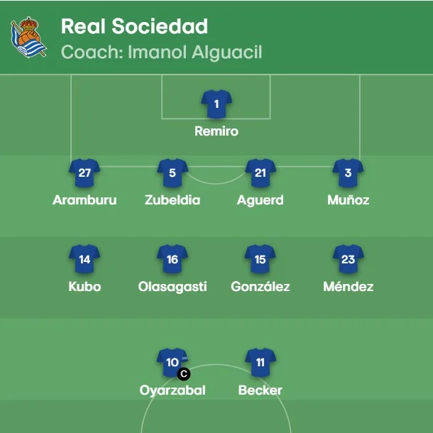 Реал Сосьєдад: Реміро – Арамбуру, Субельдія, Агерд, Айхен Муньйос – Оласагасті – Кубо, Урко Гонсалес, Браїс Мендес – Оярсбаль, Беккер