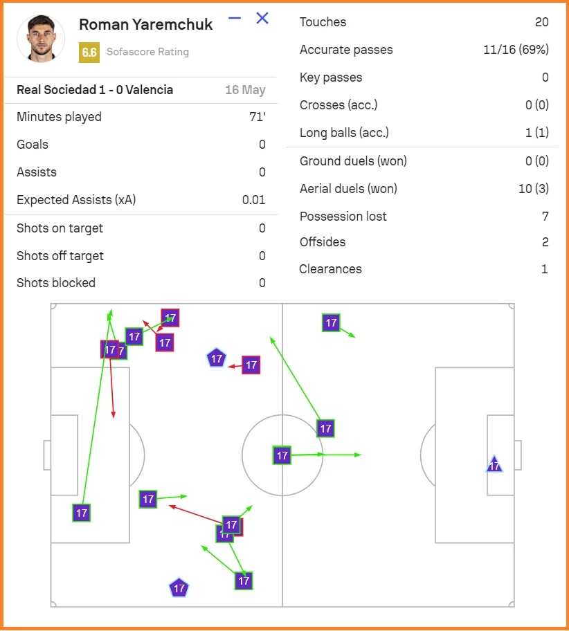 Баски володіли м'ячем, а Валенсія грала другим номер, але періодично вмикала пресинг. Починав його Яремчук. Власні атаки гості будували через довгі передачі, тому в Романа назбиралось 10 верхових дуелей (виграв три). Спроби зачепитися за м'яч частіше завершували невдало.