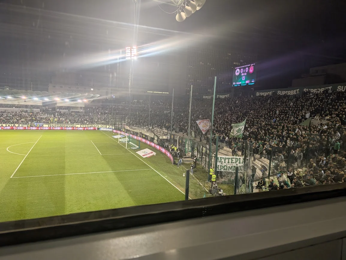 Атмосфера перед стартовим свистком була неймовірною. Леофорос – стадіон камерний, лише на 15 тисяч місць, що для дербі такого масштабу видається мізерним. Попри свою історичну велич, арена Панатінаїкоса суттєво поступається сучасним стадіонам європейських топ-клубів. Після візиту на нову домашню арену АЕКа здавалося, що я потрапив у минуле.