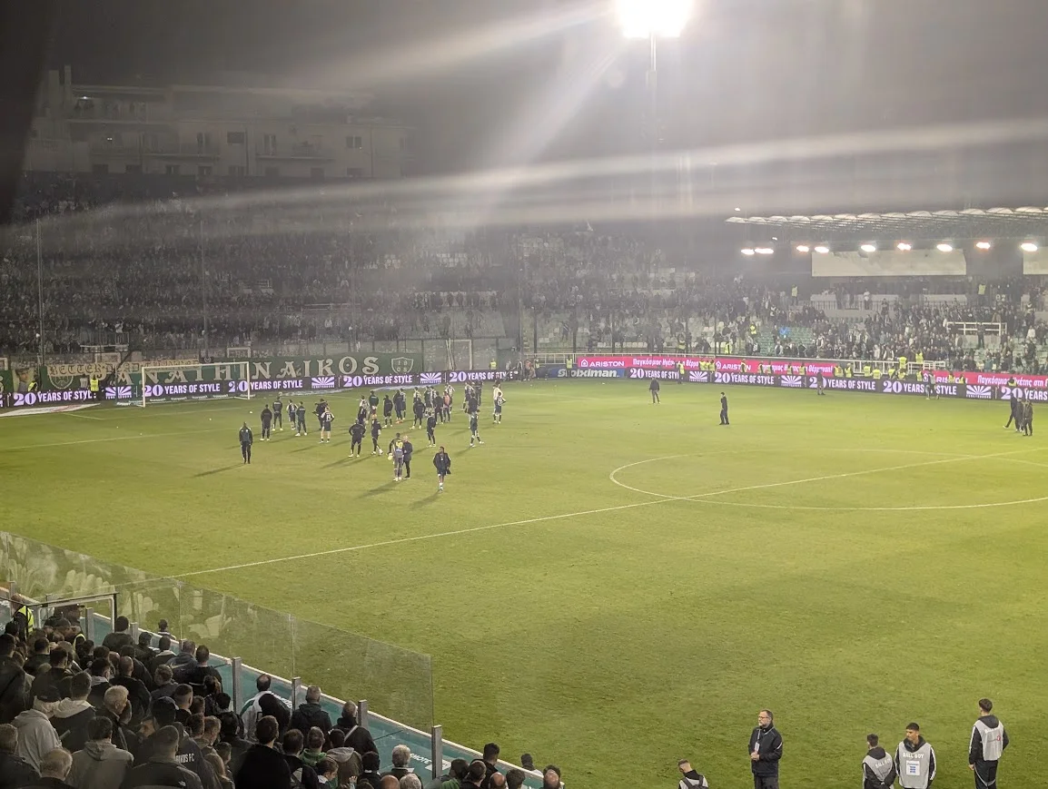 Символічно, що матч, який я відвідав, став останнім в історії протистоянь цих команд на домашній арені ПАО – стадіоні імені Апостолоса Ніколаїдіса, чи, як його ще звуть у народі, Леофорос Александрас. Після цього сезону легендарну споруду знесуть, а команда переїде на новий 40-тисячний стадіон вже наступної весни.