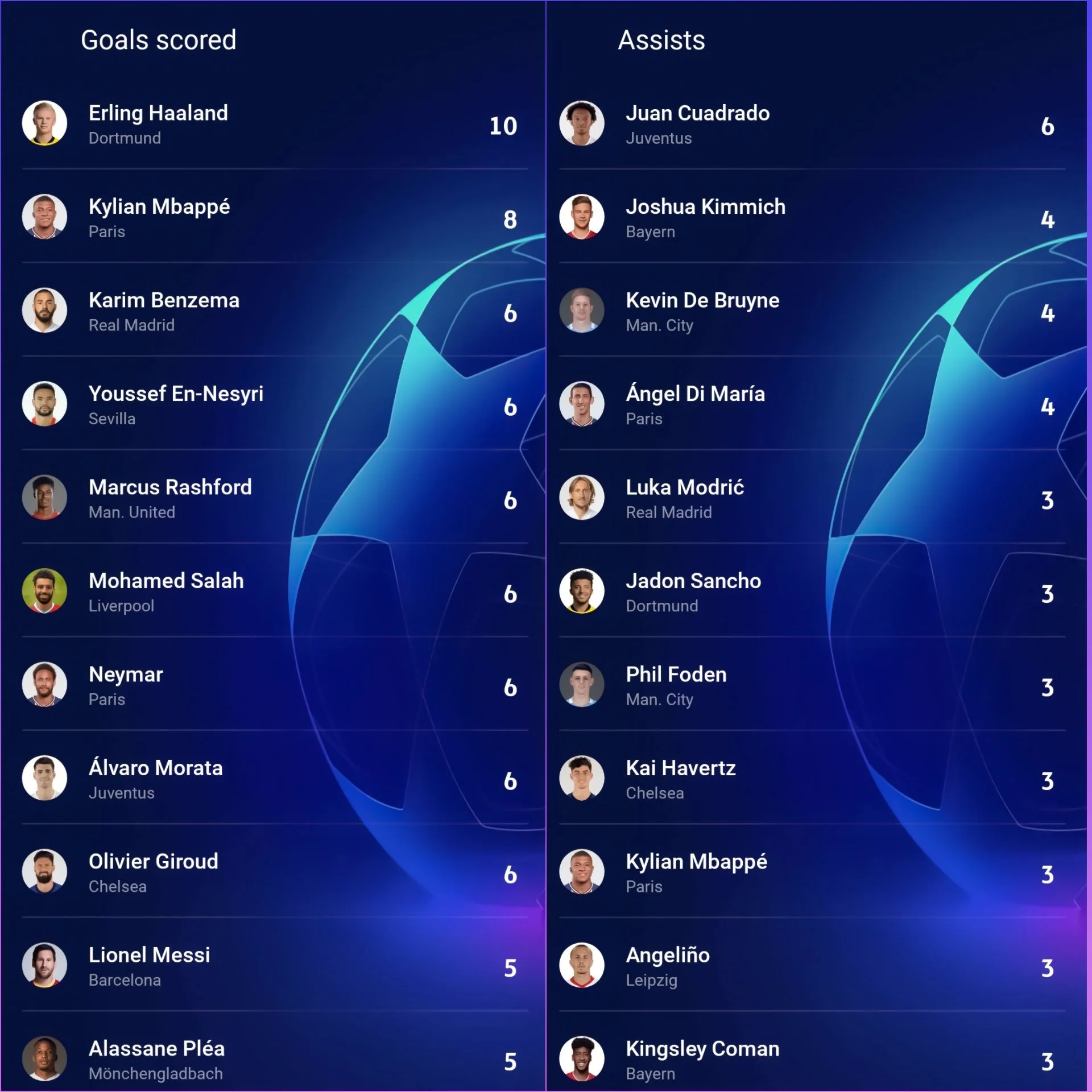 Найкращий бомбардир: Ерлінг Холанд (Борусія Д), – 10 голів, Кіліан Мбаппе (ПСЖ) – 8, Неймар (ПСЖ), Альваро Мората (Ювентус), Мохамед Салах (Ліверпуль), Олів'є Жиру (Челсі), Юссеф Ен-Несірі (Севілья), Маркус Рашфорд (Манчестер Юнайтед), Карім Бензема (Реал Мадрид) – по 6.