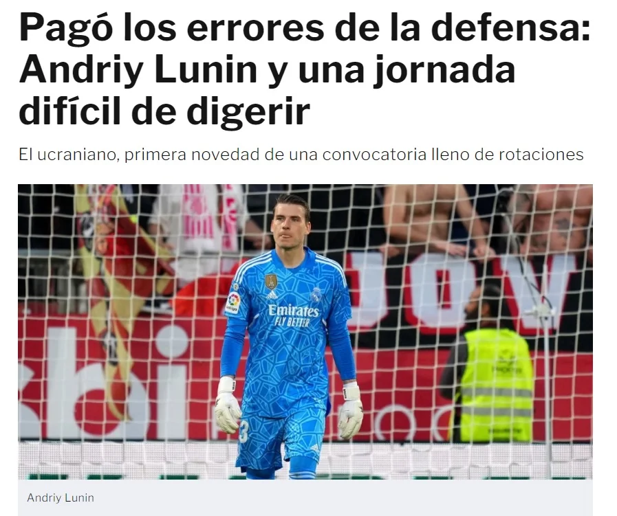Мадридська газета AS виявилась менш поблажливою до кіпера збірної України. Журналіст Серхіо Лопес де Вісенте розкритикував Луніна у матеріалі "Куртуа не має тіні". Запевнивши, що незабаром Андрію доведеться визначатись. "Лунін хоче, але не може. Матчі вислизають з його рук. Та ще й удача відвернулась. Бездоганний професіонал, один із тих, хто ніколи не скаржився Анчелотті, отримав шанс на Монтіліві через форс-мажор... проте не зміцнив власні позиції. Проблема в тому, що у ситуації Луніна – це було необхідно". На його думку, Андрій міг зробити більше під час другого і четвертого голів.
