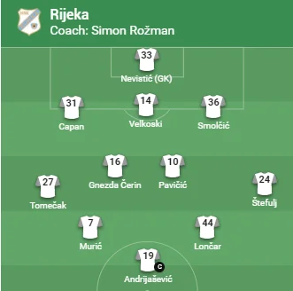 Рієка: Невістіч – Цапан, Д. Велкоскі, Смолчіч – Томечак, Гнезда Черін, Павічіч, Штефул – Муріч, Лончар – Андріяшевіч (к)