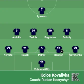 Колос: Волинець – Кравченко, Гавриш (к), Петров, Новак, Ємець – Смирний, Богданов, Задоя, Антюх – Лисенко