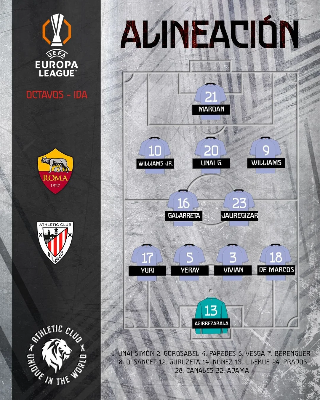 Атлетік: Агіррезабала – Де Маркос, Вівіан, Єрай, Берчіче – де Галларета, Хаурегі – Іньякі Вільямс, Унай Гомес, Ніко Вільямс – Мароан Саннаді