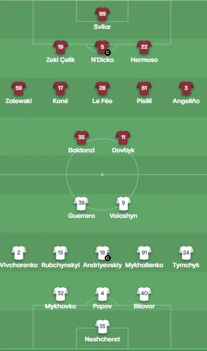 Рома: Свілар – Челік, Ндіка (к), Ермосо – Залевскі, Коне, Ле Фе, Пізіллі, Анхеліньйо – Бальданці, Довбик