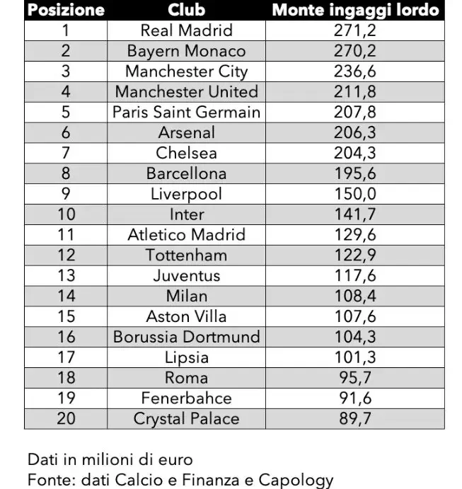 Лідирують у цьому рейтингу Реал і Баварія – ці клуби платять своїм футболістам 271,2 і 270,2 млн євро відповідно. Манчестер Сіті зі своїми 236,6 млн євро зарплатної відомості – лише третій. Також позначку в 200 млн євро перетнули Манчестер Юнайтед, ПСЖ, Арсенал і Челсі. Барселона трохи не дотягнула (195,6 млн євро), а показник Ліверпуля зовсім дивовижний на тлі інших грандів – лише 150 млн євро.