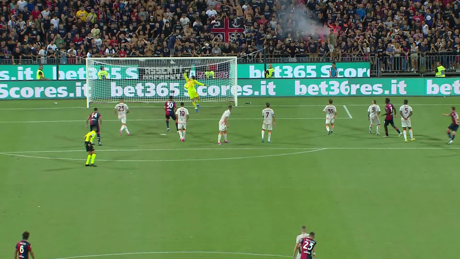 Однак найкращий шанс був у Пеллегріні. Капітану допоміг Артем Довбик. Українець нібито пішов на передачу від Залевскі, але пропустив м'яч, тож Лоренцо зміг пробити приблизно із зони для виконання пенальті. На жаль для фанів "джалороссі", м'яч пішов по центу, а Скуффет зумів скластися й забрати.