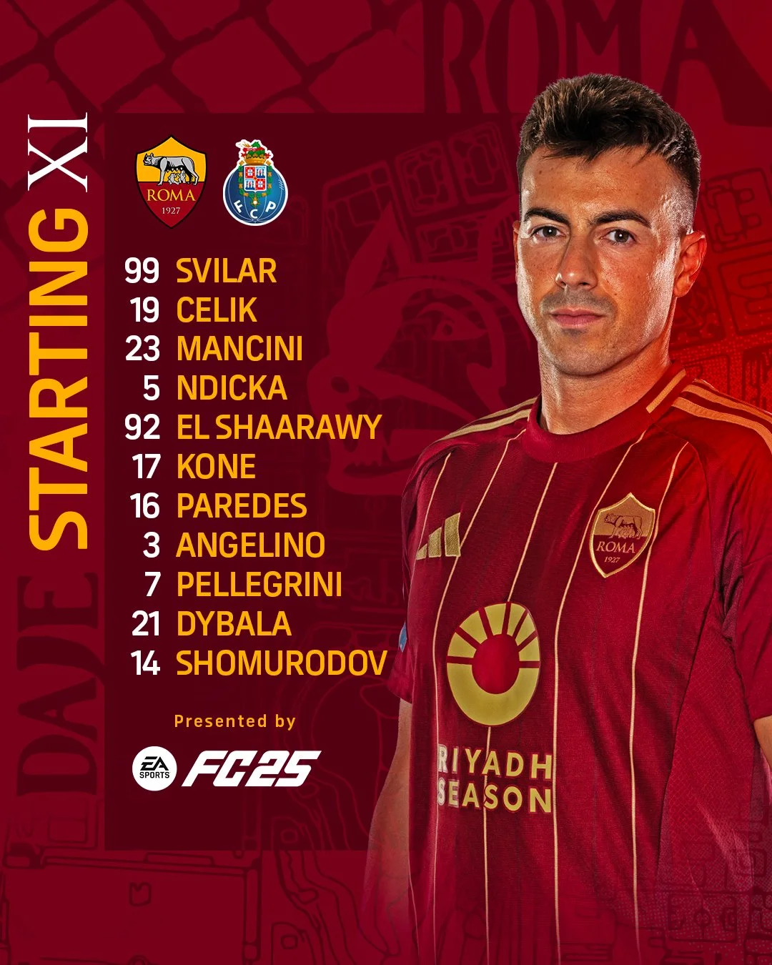 Стартовий склад Роми: Свілар – Челік, Манчіні, Н'Діка – Ель-Шаараві, Коне, Паредес, Анхеліньо, Пеллегріні – Дибала, Шомуродов.
