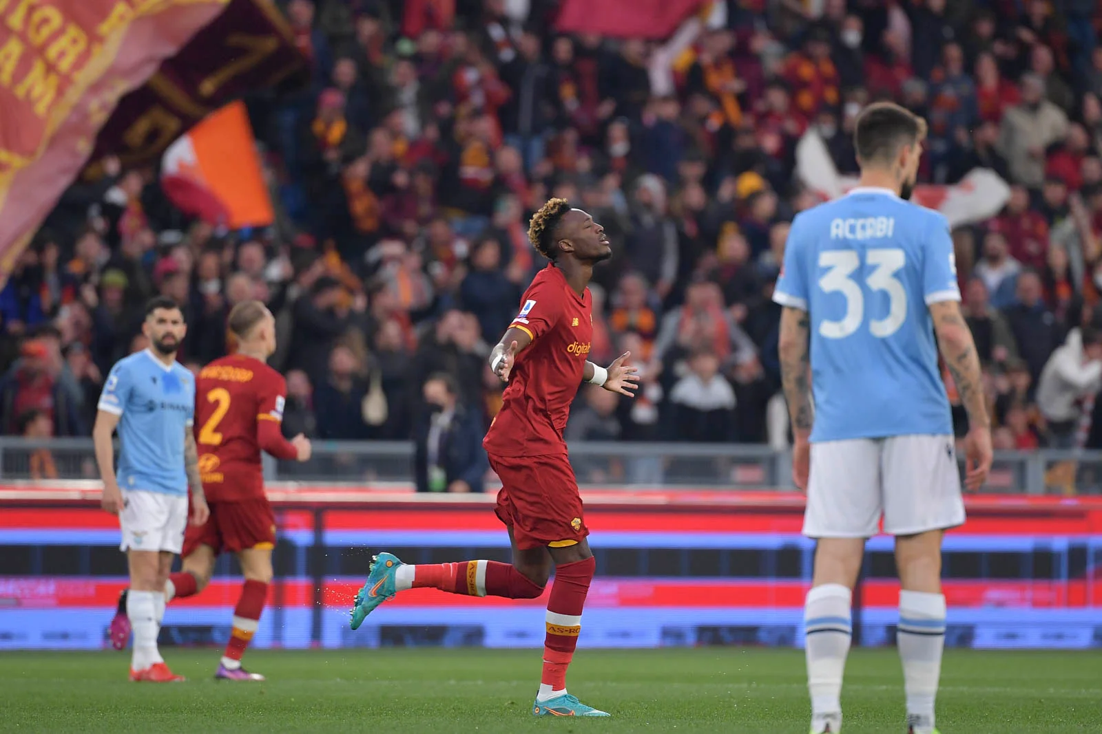 Франческо Тотті знімав на iPhone перфоманс Курва Суд, а буквально за кілька миттєвостей Імператор, гравці та тіфозі "джалороссі" вже шаленіли, святкуючи забитий гол. Лоренцо Пеллегріні прямим ударом з кутового влучив у поперечину, а Таммі Абрахам коліном заштовхав м'яч у ворота Стракоші. 1:0 на користь Роми вже на першій хвилині – ідеальний старт для команди Жозе Моурінью! Йшла 56-та секунда – найшвидший гол в дербі в історії Роми.