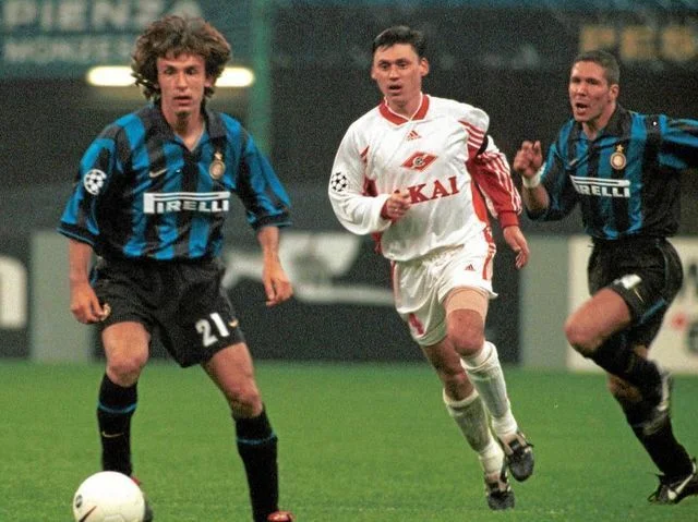 Молодий Андреа Пірло контролює середню лінію міланського Інтера з великим Дієго Пабло Сімеоне (97/98). Доповнює розкішне фото українець Ілля Цимбаларь, який несподівано пішов з життя у грудні 2013-го.