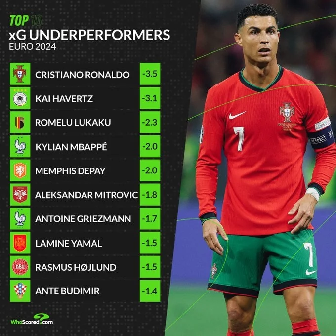 Проблеми з реалізацією моментів призвели до того, що Кріштіану став найгіршим гравцем минулого чемпіонату за цим компонентом, повідомляє WhoScored. Згідно з системою xG, 39-річний форвард повинен був забити щонайменше три м'ячі (це показник найкращих бомбардирів турніру).