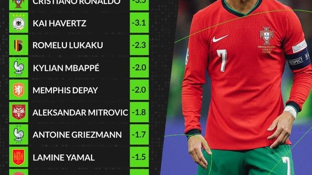 Недалеко від португальця розташувався Кай Хаверц. Німець хоч і забив два голи на домашньому Євро, але ще й має -3,1 xG. Трійку невтішного рейтингу довершує Ромелу Лукаку (бельгієць на турнірі не забивав взагалі).