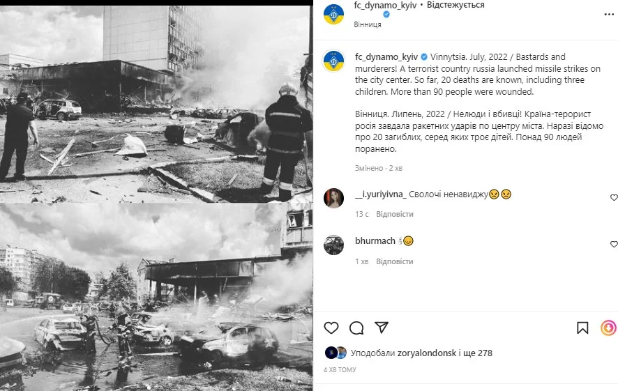 13:13. Зінченко повторив побажання здохнути для Путіна, виклавши відео розбомбленої Вінниці. Серед нових мирних жертв абсурдної терористичної атаки Росії на цивільні об'єкти маленькі діти. Динамо, Циганков, Шевчук, Шахтар та інші дотичні до нашого футболу також висловилися про жахливу трагедію.