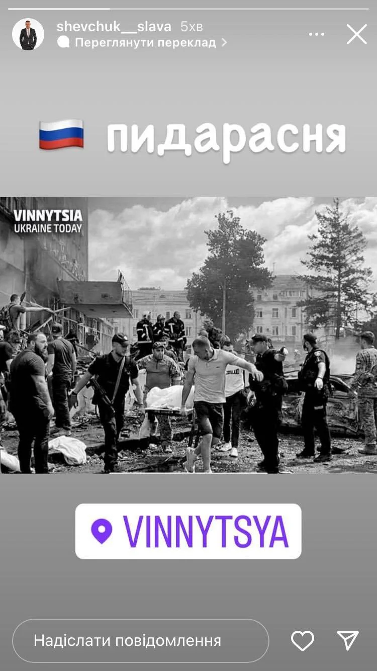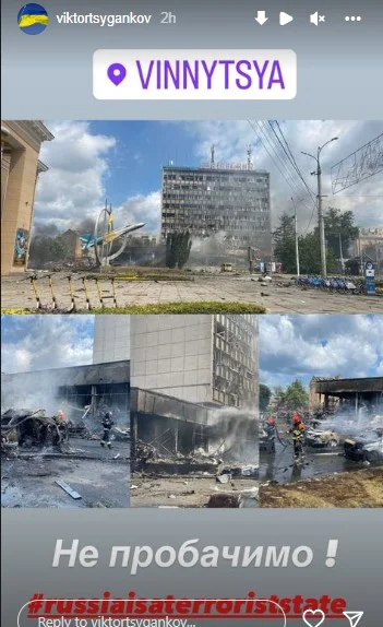 17:34. Колишній гравець збірної Євген Левченко лаконічний у Twitter: "Вінниця. Україна. Російські вбивці, просто знищують невинних людей. Щонайменше 12 загиблих і 90 травмованих. "Рускій мір".