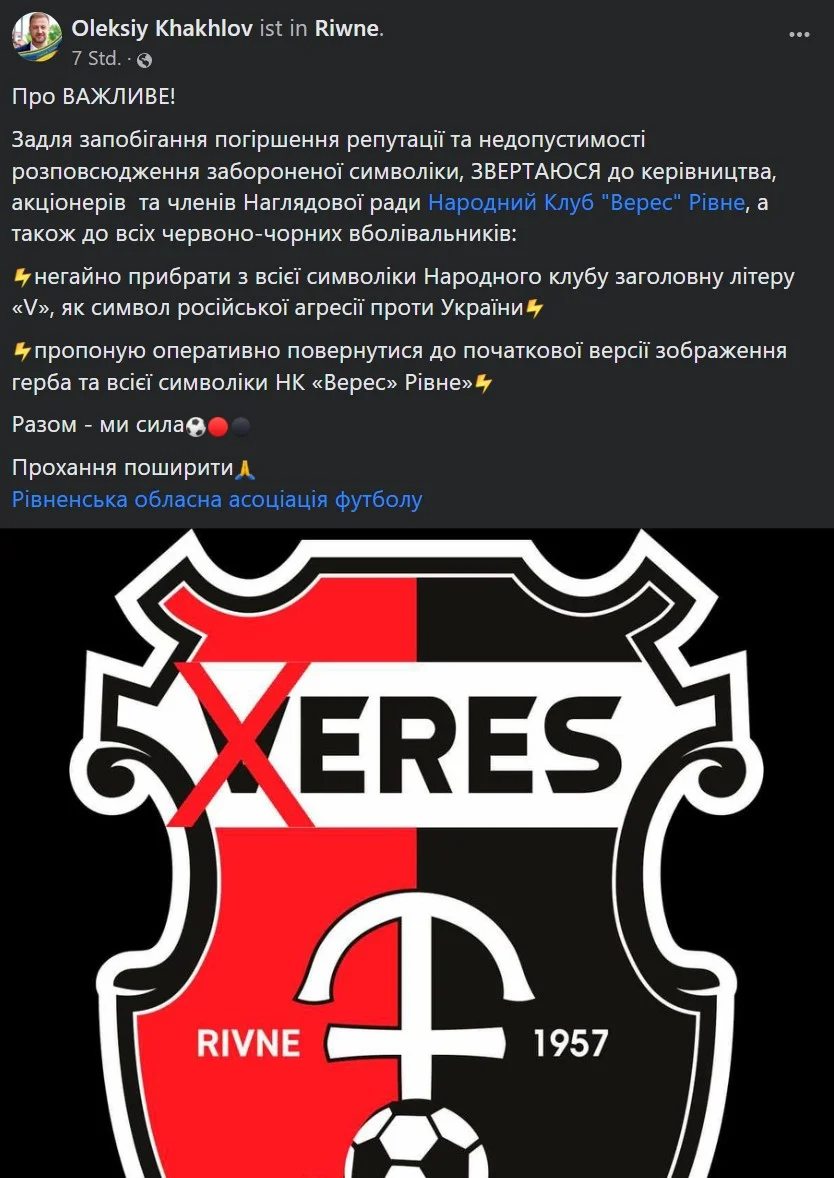 19:00. Експрезидент Вереса Олексій Хахльов закликав прибрати з символіки команди літеру "V".