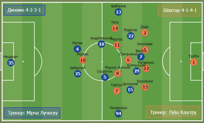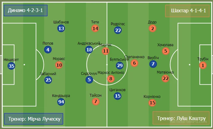 Спрогнозувати стартовий склад Динамо було дуже просто. У Луческу практично не було вибору. Він поставив той же склад, що й у матчі з Барселоною, за винятком чергових втрат – Супряги і Шепєлєва. Очікувано повернувся Сидорчук, який не грав із Барсою через дискваліфікацію. Повернувся, щоб услід за червоною карткою в Лізі чемпіонів заробити вилучення і у надважливому матчі УПЛ. Ваги цьому безглуздому вчинку Сергія значно додали кадрові проблеми, з якими зіткнулося Динамо.