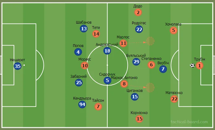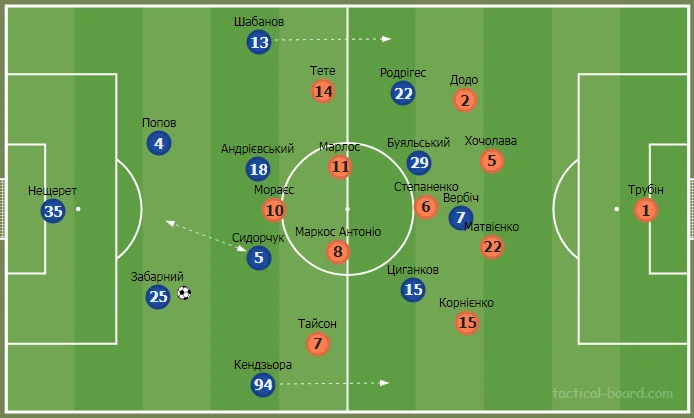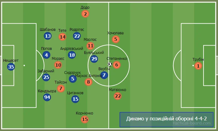 У другому таймі Динамо грало за схемою 4-4-1, Вербіч залишився форвардом, а пару центральних хавбеків склали Андрієвський та Буяльський.