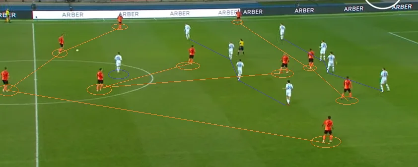 Інколи Шахтар використовував проактивні методи оборони, а саме – високий пресинг. Переважно він вмикався по тріггеру. Імпульсом для колективного тиску був пас киянами назад на своїй половині поля. Це дуже важливий аспект гри, у якому Шахтарю потрібно працювати перш за все.