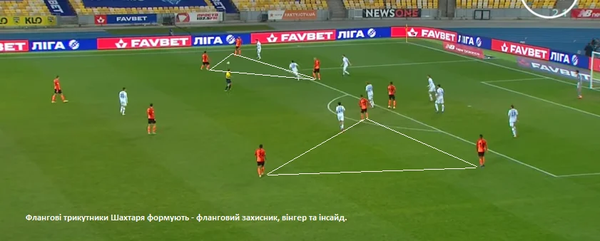 На схемі вище – структура позиційної гри Шахтаря в атаці. Донеччани постійно створювали трикутники на флангах. У їхній побудові брали участь фланговий захисник, вінгер та інсайд (класична вісімка). Часто три гравці, Степаненко та два центрбеки залишалися позаду – проти одного форварда Динамо. Це ще один приклад надмірної обережності "гірників".