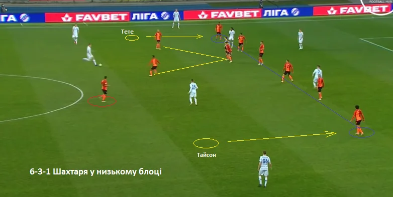 Наприкінці матеріалу поглянемо (на скріншоті) на ще один прояв невпевненості у власних силах. Це перший тайм, гра при рівних складах. Динамо доставляє м'яч у фінальну третину, Шахтар перебудовується на свої вже фірмові (після Ліги чемпіонів) 6-3-1. Вінгери Тайсон та Тете сідали у лінію захисту. Як тільки вдавалося вичавити м'яч трохи вище, команда Каштру завдяки позиціям вінгерів знову поверталася до структури 4-1-4-1.