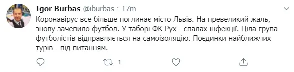 У львівській команді спалах коронавірусу, інформує журналіст ТК Футбол Ігор Бурбас у своєму Твіттері.