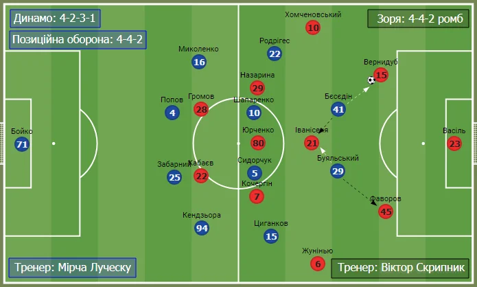 У фазі гри без м'яча Динамо перебудовувалося на структуру 4-4-2. Вінгери Родрігес та Циганков сідали у лінію до центральних хавів, а Буяльський з Бесєдіним формували першу ланку оборони. Кияни намагалися постійно закривати умовну "шістку" Зорі – Іванісеню –, який має важливе значення у побудовах позиційних атак своєї команди. Опорника луганців почергово передавали один одному Буяльський та Бесєдін. При білд-апі Зорі один нападник тиснув на ближчого до нього центрбека, який володів м'ячем, інший тримав Іванісеню.