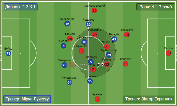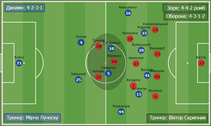 Стартовий склад Динамо був достатньо прогнозованим і максимально оптимальним. Щодо Зорі, то тут від початку були питання у лініях оборони та атаки. Тренерський штаб луганського клубу мав чіткий стратегічний план з запланованими замінами й тактичними перебудуваннями.