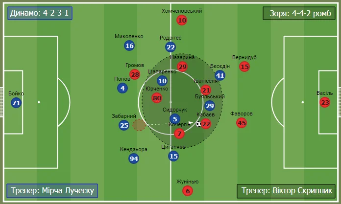 Динамо та Зоря почали матч за своїх базових тактичних схем. Кияни будували гру за структурою 4-2-3-1, а команда Віктора Скрипника протиставила супернику фірмовий діамант у центрі поля – ромб 4-4-2 чи 4-1-2-1-2, кому як більше подобається.