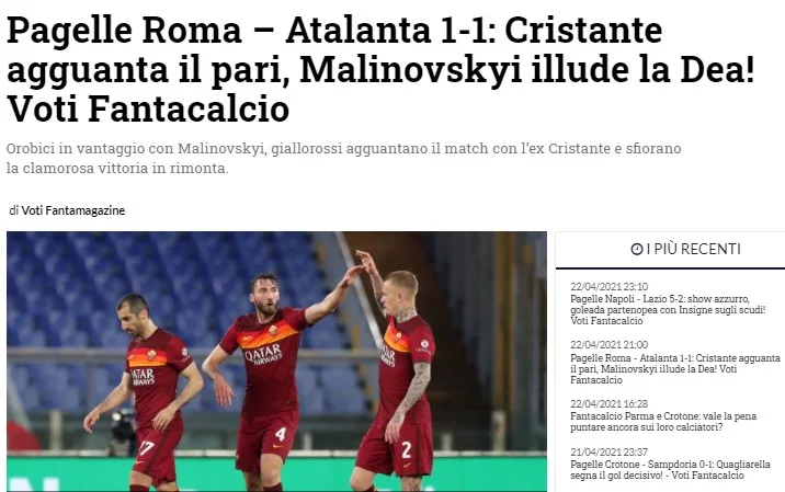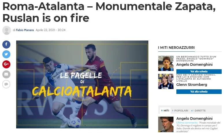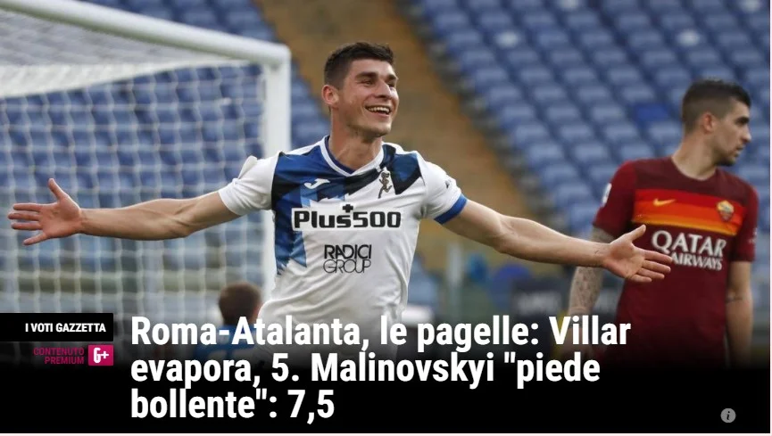Українець вийшов на поле римського красеня Олімпіко у стартовому складі Аталанти, відігравши майже годину, і цього виявилось достатньо, аби потрапити на перші шпальти італійських газет. Руслан вправно диригував оркестром з Бергамо, намагався діяти гостро та нестандартно. Оборона Фонсеки неабияк настраждалась від креативних передач нашого хавбека (4 ключові), зрештою він записав до свого активу єдиний результативний удар у гостей. Маліновський – топ, вважає спортивна преса Апеннін.