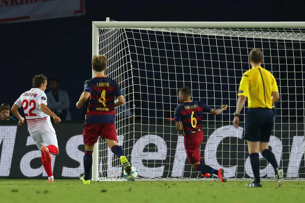 Українець Євген Коноплянка вийшов на заміну на 68-й хвилині при рахунку 4:2 і став героєм Севільї". Євген зрівняв рахунок на 81-й хвилині, зробивши його 4:4 і перевівши матч в овертайм. Але в додатковий час "Барселона" забила 5-й гол і врешті здобула перемогу у Суперкубку Європи.